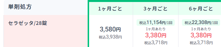 いくつか、オンライン診療でのセラゼッタの価格のサンプルを載せてみますね。こんな感じです。